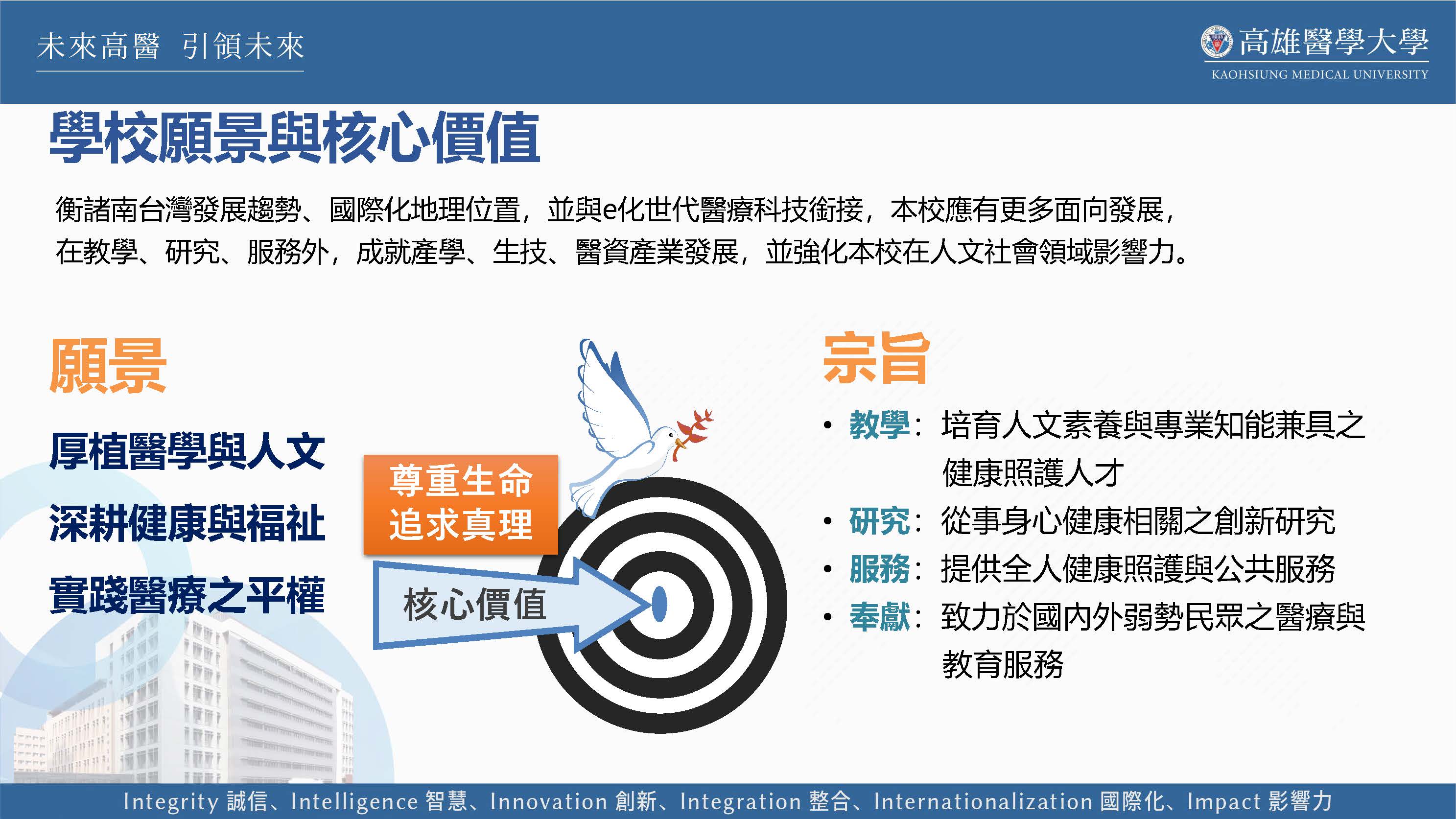 在多變的社會與環境的變遷與挑戰下,本校恪守「尊重生命、追求真理」核心價值,遵循余明隆校長「誠信智慧、創新整合、未來高醫、引領未來」的治校理念,及「培育具文化底蘊、宏觀視野與智慧創新,領導未來之優質人才;聚焦前瞻研發,深化產學協力,拓展全球研究連結;深耕在地合作,推動跨域實踐,履行大學社會責任;精準校務管理,推行行政再造,實現校院共榮永續經營」四大發展目標建構以「i6(Integrity誠信、Intelligence智慧、Innovation創新、Integration整合、Internationalization國際化、Impact影響力)」為基礎發展的未來大學,結合董事會、學校、附屬機構之資源,以高醫71年建立之尊嚴、典範、誠信、關懷、堅毅、同行的精神,引領全體教職員工生實踐「厚植醫學與人文,深耕健康福祉,實踐醫療平權」之理想。